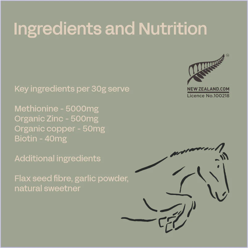 Flax seed fibre, methionine, biotin, organic zinc, organic copper, garlic powder, natural sweetener.