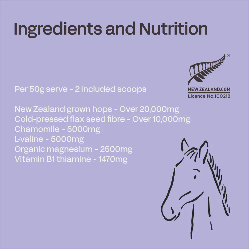 New Zealand grown hops, flax seed fibre, chamomile, L-valine, organic magnesium, vitamin B1 thiamine.Β