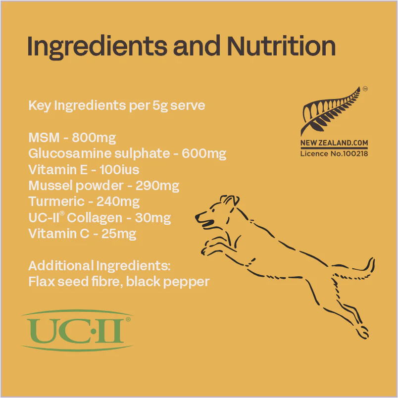Flax seed fibre, MSM (methyl sulphonyl methane), glucosamine sulphate, vitamin E, NZ green lipped mussel powder, turmeric, black pepper, UC-II collagen®, vitamin C.