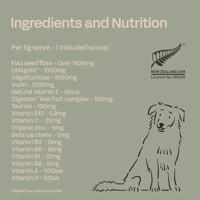 New and improved formulation with added B vitamins and kiwi fruit, from January 2025: Flax seed fibre, DHA gold®, oligofructose, chicory inulin root, natural vitamin E, Digesten® kiwi fruit complex, taurine, vitamin B12, vitamin C, organic zinc, beta carotene, vitamin B3, vitamin B6, vitamin B1, vitamin B2, vitamin A, vitamin D.