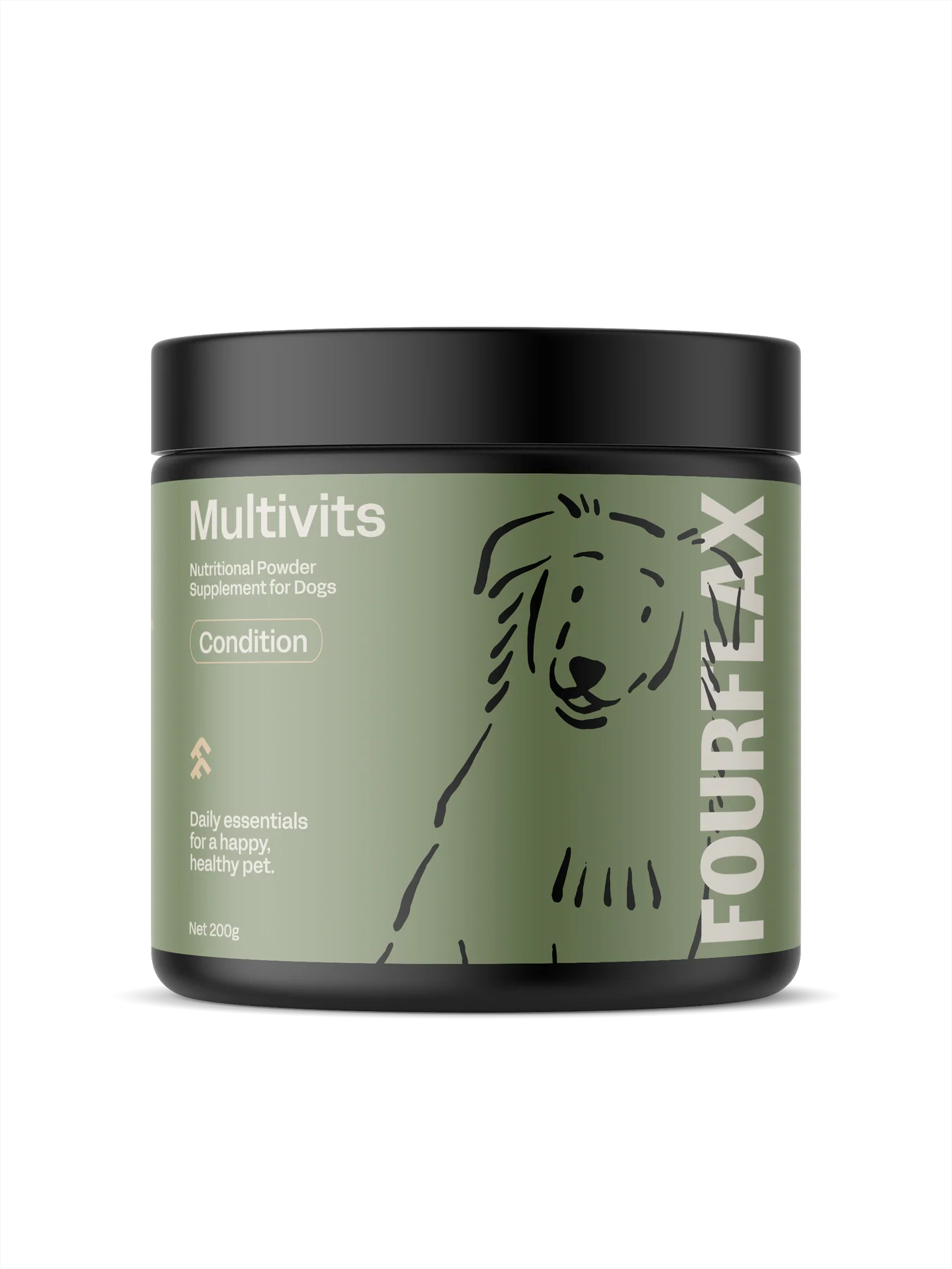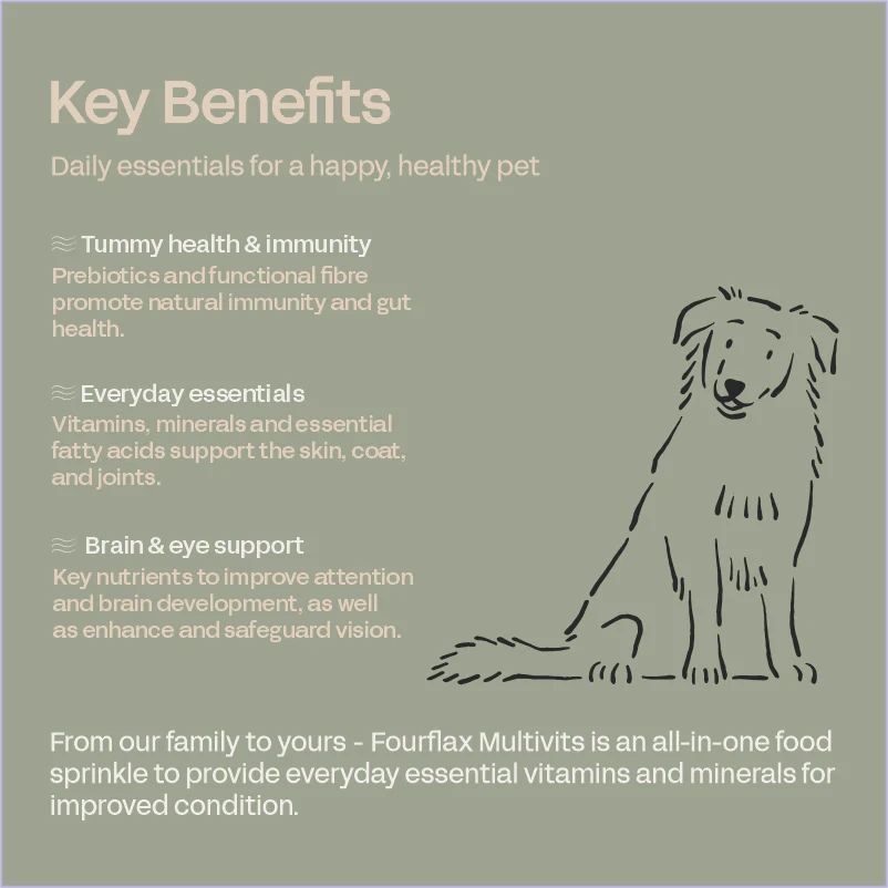 Fourflax Multivits is a powerful blend of everyday essential vitamins, minerals and essential fatty acids support the skin, coat, and joints. Packed full of prebiotics and functional fibre for a healthy tummy and to build natural immunity. Key nutrients can help to improve attention and brain development, as well as enhance and safeguard vision.