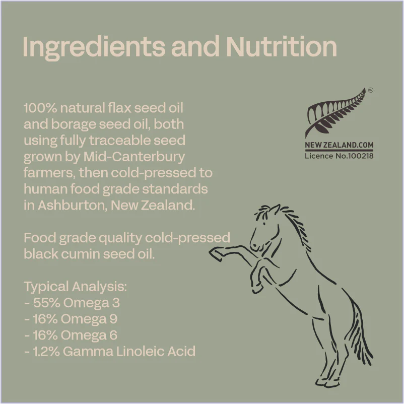 100% natural cold-pressed flax seed oil, borage seed oil and black cumin seed oil.Β