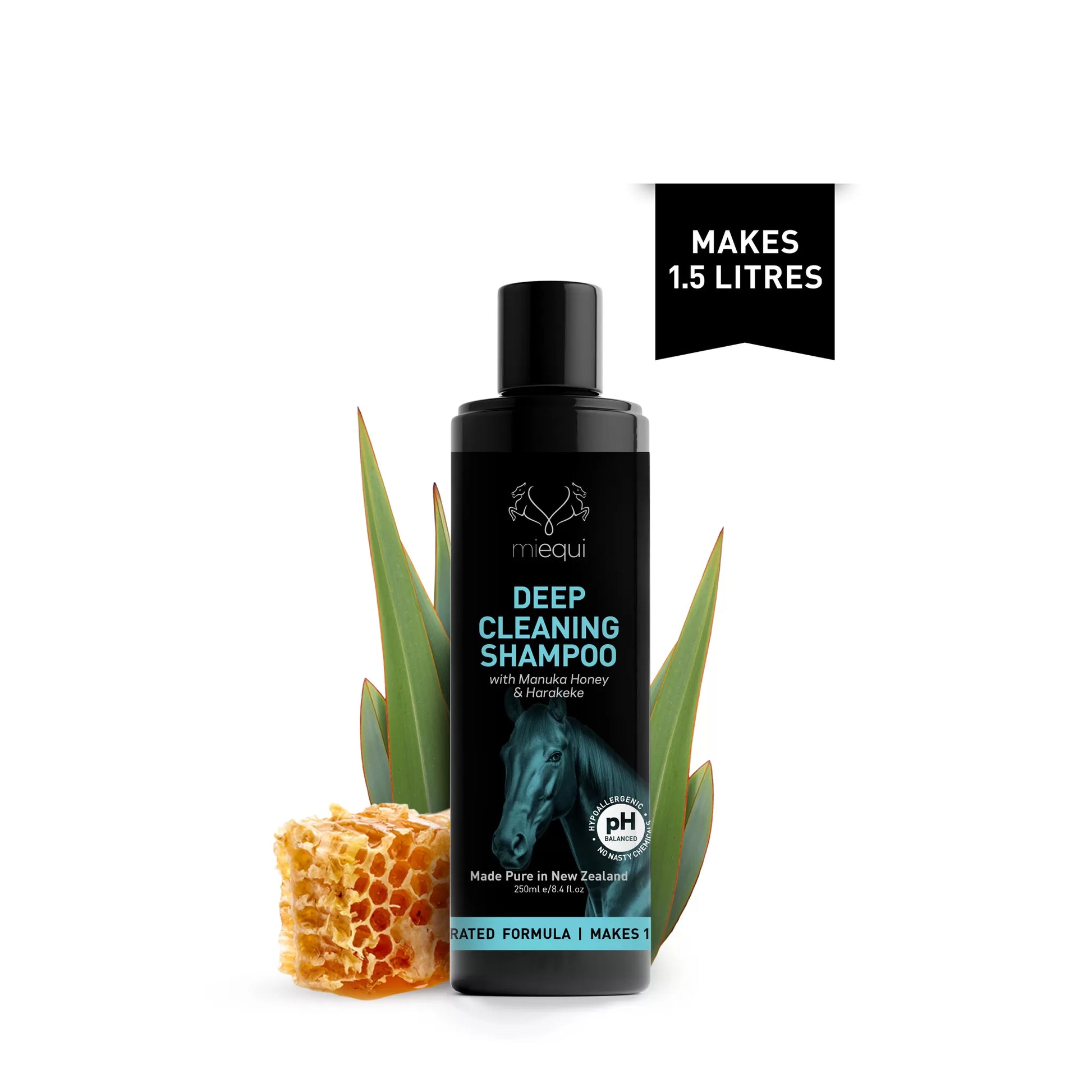 MIEQUI DEEP CLEANING SHAMPOO is for all coat colours and contains New Zealand Manuka Honey & Harakeke – nature’s nourishing, soothing and anti-inflammatory moisturiser with three times the hydration power of Aloe Vera and Olive oil.