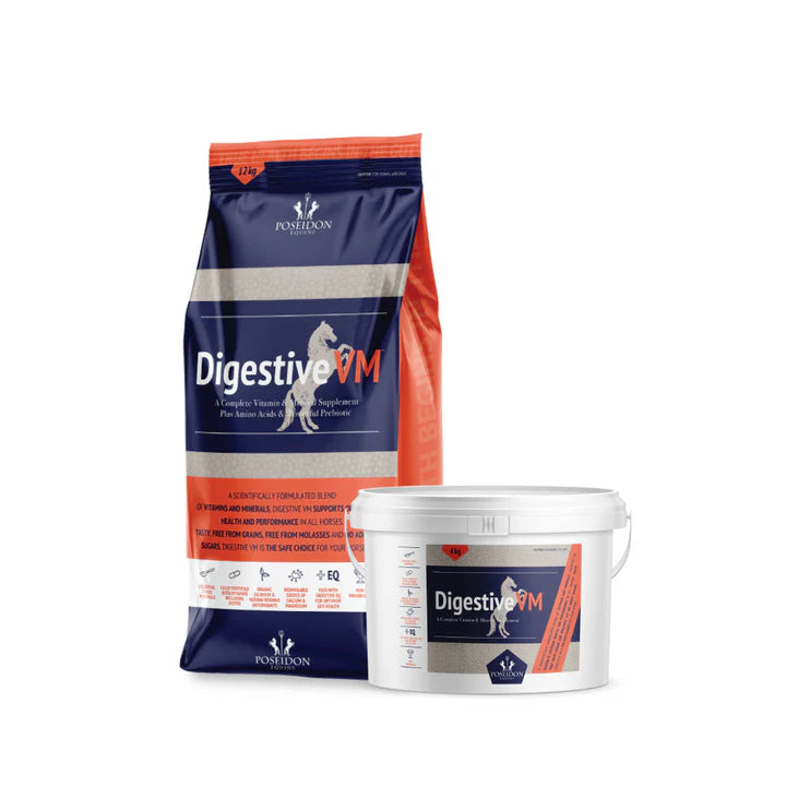 Plus, yeast-derived prebiotics and postbiotics are included to support a healthy hindgut environment which promotes optimal fibre fermentation to supply your horse with a cool source of energy and production of vitamins including B-group vitamins for calm behaviour. Free from sugars, grains and molasses, Digestive VM is platinum standard for next level health, which makes it a good option for horses prone to laminitis, diagnosed with PPID (cushings) or PSSM and overweight horses on an energy restricted diet, as well as horses in all disciplines from recreational riding to racing and high level performance.