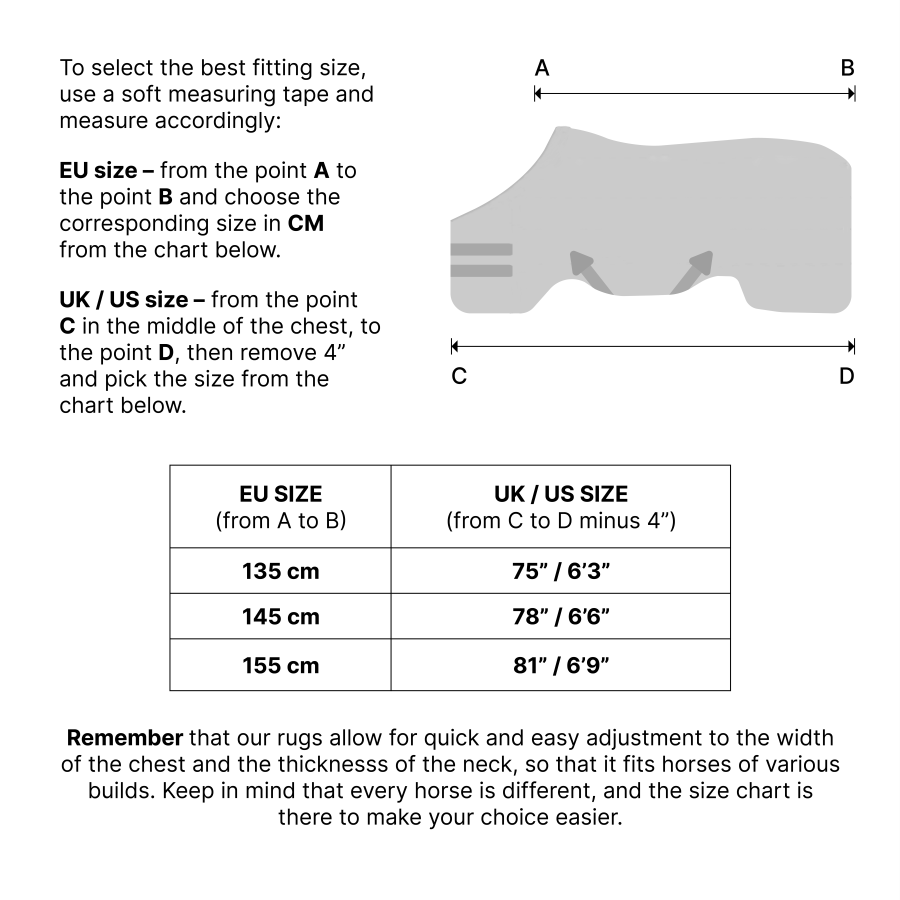 To make it easier to choose the right length, we have prepared a special fitting chart - our recommendations are based on experience with various horses of different builds and sizes.